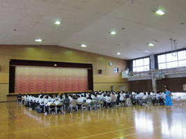 | <平成24年度対面式>(4月10日) 新入生と在校生の対面式がありました。 各クラスの紹介が先輩たちからありました。 |