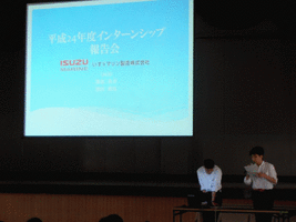 | <インターンシップ報告会>(5月17日) 3年生によるインターンシップ報告会がありました。 今年度インターンシップに行く予定の2年生は 真剣に報告を聴いていました。 |