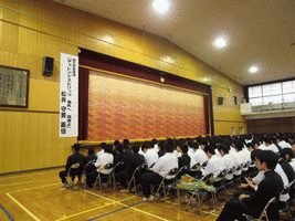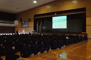 | <交通安全学習会>(12月18日) 交通安全学習会が行われ、DVD視聴と講話が ありました。生徒は真剣に聴いていました。 |
