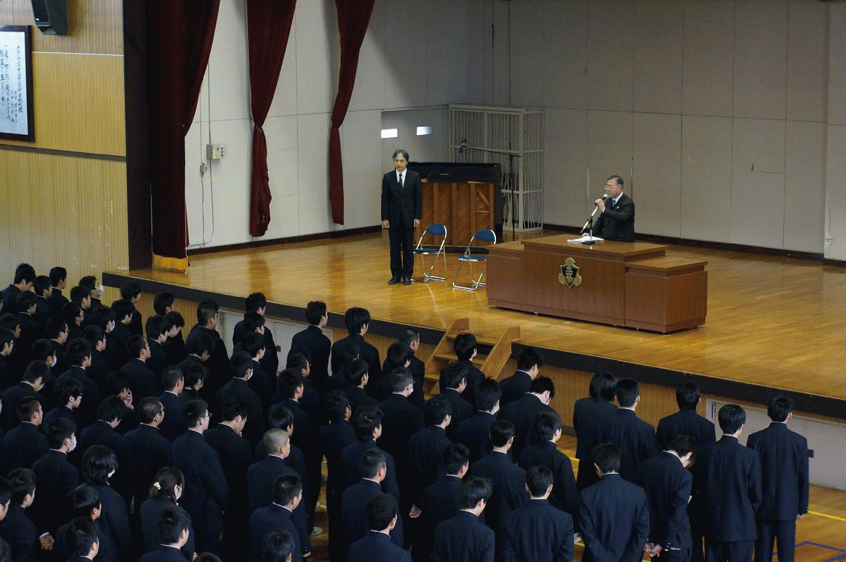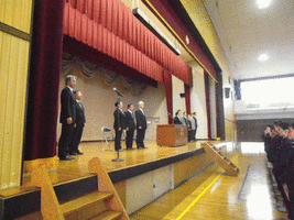 | <新任式・始業式>(4月6日) 新しく本校に、14名の先生が着任されました。新任職員代表で、 關教頭先生より御挨拶をいただきました。 |