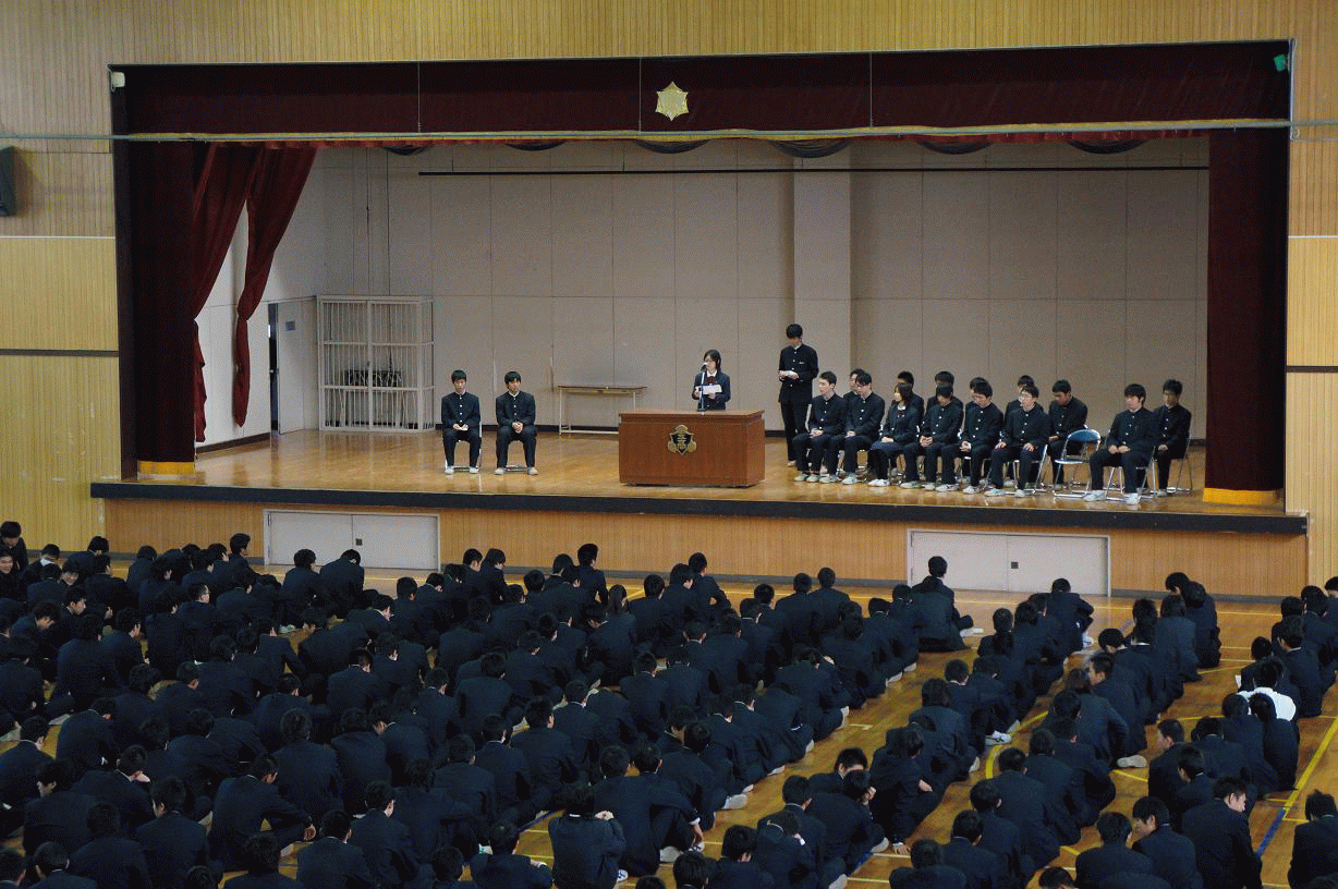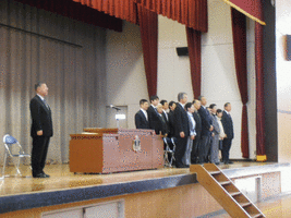 | <生徒会新役員認証式>(1月7日) 始業式と生徒会新役員認証式が行われました。 生徒会新役員は希望と自信に満ち溢れていました。 |