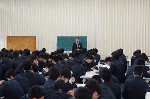 | <2年生進路ガイダンス>(3月18日) 本日、2年生(新3年生)の進路ガイダンスが 行われました。 就職、大学、専門学校、公務員に分かれ 講話や面接指導などが行われました。 |