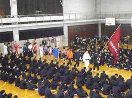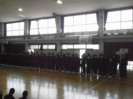 | <平成24年度部活動壮行会>(4月12日) 部活動の壮行会がありました。 教頭先生からの激励の言葉がありました。 全校生徒・職員も活躍を期待しています。 |