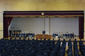 | <新任式・始業式>(4月8日) 新しく本校に、18名の先生が着任されました。新任職員代表で、 沼澤先生より御挨拶をいただきました。 |
