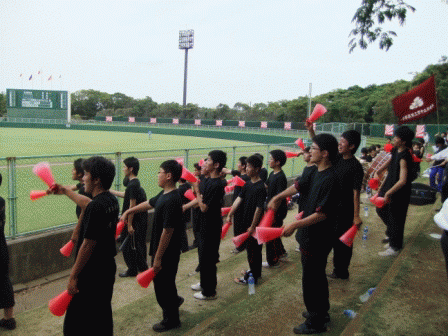 | <野球応援>(7月16日) 習志野秋津野球場で2回戦我孫子高校との 試合で野球部・吹奏楽部・応援委員会での 野球応援が行われました。6回まで4−2と リードをしていましたが、7回に同点に追いつ かれ、延長で11回まで頑張っていましたが、 惜しくも敗れました。野球関係者の皆様、 本当にお疲れ様でした。 |