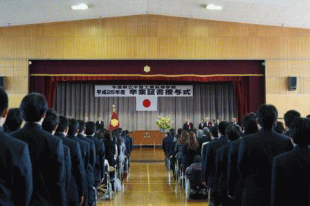 | <平成25年度 卒業証書授与式>(3月4日) 本日、10時から卒業式が行われました。 式は厳粛に行われ、 たくさんの来賓者もお見えになりました。 全日制189名、定時制28名が卒業致しました。 |
