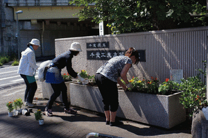 | <植栽(ガーデニング)>(6月27日) 美化委員会の1年生とPTAの保護者と 千葉工業高校OBの方とで学校の植栽が 行われました。 これから式典などが行われる際に来校される 人々の目を楽しませてくれます。 |