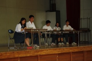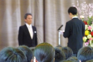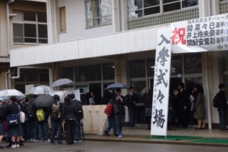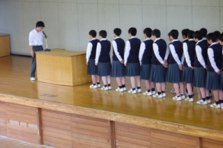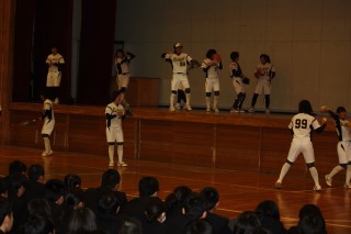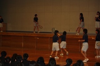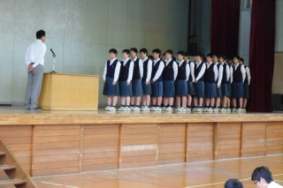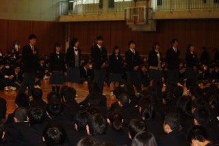 | 4月11日(火) 新入生歓迎会 午後から対面式.新入生代表挨拶.生徒会本部役員紹介.部活動紹介が行われました。部活動紹介では,各部とも趣向を凝らした演技を見せていました。 |