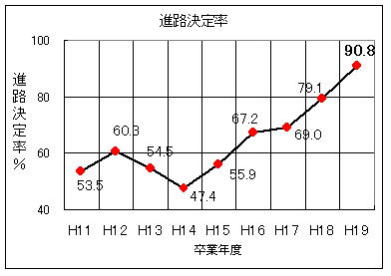 ・進路実績が大幅に向上した。進路決定率は90%を超え、大学進学率が増えている。。また、学校行事や部活